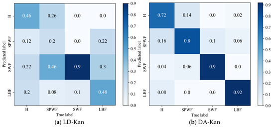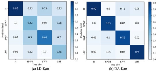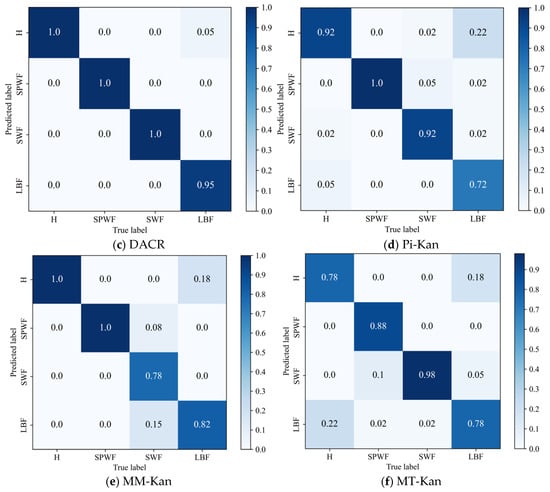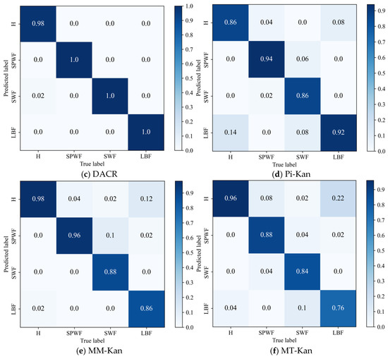 Figure 13 illustrates the confusion matrices of the LD-Kan, DA-Kan, Pi-Kan, MM-Kan, MT-Kan, and DACR approaches to visually compare the diagnostic effectiveness of each model. The results indicate that the DACR approach significantly outperforms the other models in terms of classification accuracy in different categories, displaying excellent diagnostic capability.