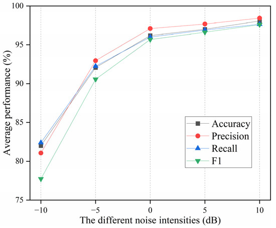 This session analyzes the performance variation in the DACR approach under different noise levels, using the same dataset and various parameter settings as in Case 1. The experimental is designed to cover five different strengths of signal-to-noise ratios, namely −10 dB, −5 dB, 0 dB, 5 dB, and 10 dB. The mean result variation trend of ten trials for each evaluation index is illustrated in Figure 15.