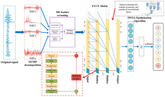 The MESO-TCN model is a multi-scale optimized convolutional network designed for fault diagnosis of rolling bearings, aiming to enhance feature extraction and recognition capabilities under non-stationary and high-noise vibration conditions. The model consists of three components: the raw vibration signal is first processed using Ensemble Empirical Mode Decomposition (EEMD) combined with a hybrid entropy-based screening mechanism to suppress redundant noise and reconstruct informative feature sequences; then, an extended-kernel temporal convolutional network (ETCN) incorporating a Multi-Scale Dilated Convolution Block (MSDCB) within the residual module is employed to extract temporal features at multiple scales using causal convolutions with varying dilation rates, with learnable weight fusion to highlight critical patterns; finally, an improved whale optimization algorithm (IWOA) enhanced by a firefly-inspired brightness mechanism is adopted to globally optimize convolutional parameters such as learning rate and channel number. The complete structure of the MESO-TCN model is illustrated in Figure 1.