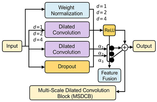 To this end, in this paper, a Multi-Scale Dilated Convolution Block (MSDCB) is introduced into the residual module structure of TCN, as shown in Figure 2.