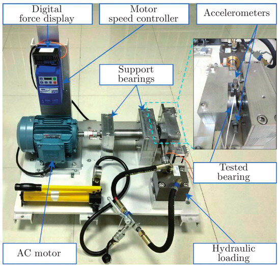 The data acquisition platform is composed of an AC motor, a motor speed controller, a rotating shaft, support bearings, a hydraulic loading system and test bearings, etc. The acquisition platform is shown in Figure 5.