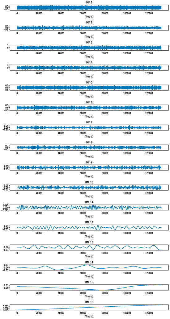 Bearing 2_1 data subset under working condition 2 is taken as an example to carry out the preprocessing experiment. In this paper, the Integrated Empirical Mode Decomposition (EEMD) is adopted to decompose the original vibration signal, aiming to effectively distinguish the potential characteristic information from the high-frequency noise, thereby providing a more discriminative signal basis for the subsequent diagnostic modeling. Figure 6 shows several typical intrinsic mode function (IMF) components of this signal obtained under EEMD processing.