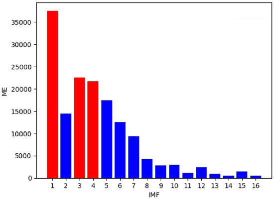 ME values for different IMF components.( The red bars represent IMF components with relatively large mixed entropy values, which are retained for signal reconstruction. The blue bars indicate components with lower entropy values, which are discarded as they contribute less meaningful information.)