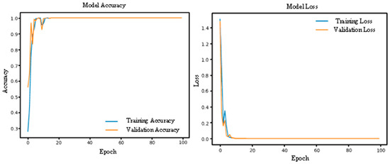 As shown in Figure 8, the accuracy of the model rapidly improves with the number of iterations during the training process, and tends to saturate after about the 20th round, basically stabilizing at a level close to 100%. At the same time, the loss function shows a continuous downward trend and rapidly converges in the early stages, with the minimum value remaining at a low level, indicating that the constructed model performs well in both training efficiency and convergence performance.