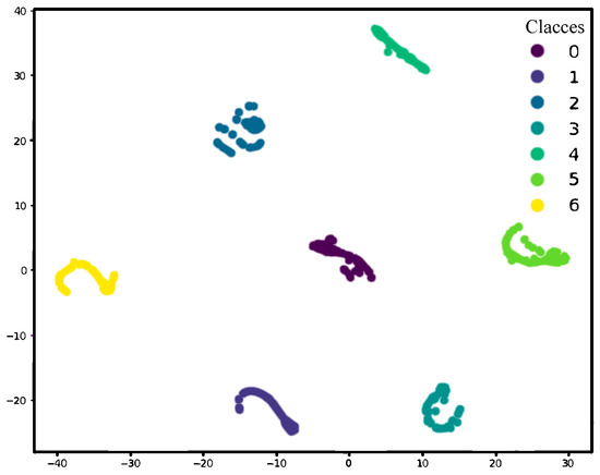 To further analyze the feature discrimination ability of the model, this paper uses the T-SNE method to reduce and visualize the high-dimensional feature vectors extracted by the network, as shown in Figure 9. The clear distribution of samples of different categories on the two-dimensional plane and the clear clustering boundaries indicate that the proposed method has good feature abstraction and category separability.