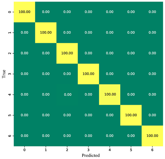 In addition, to evaluate the specific classification performance of the model on different types of faults, Figure 10 shows the confusion matrix results of the model on the test set. The horizontal and vertical axes in the figure correspond to the predicted and true labels of the model, respectively. It can be observed from the figure that the classification accuracy of each category sample is high, and the misjudgment rate is low, further verifying the reliability and robustness of the proposed method in multi-class fault diagnosis tasks.