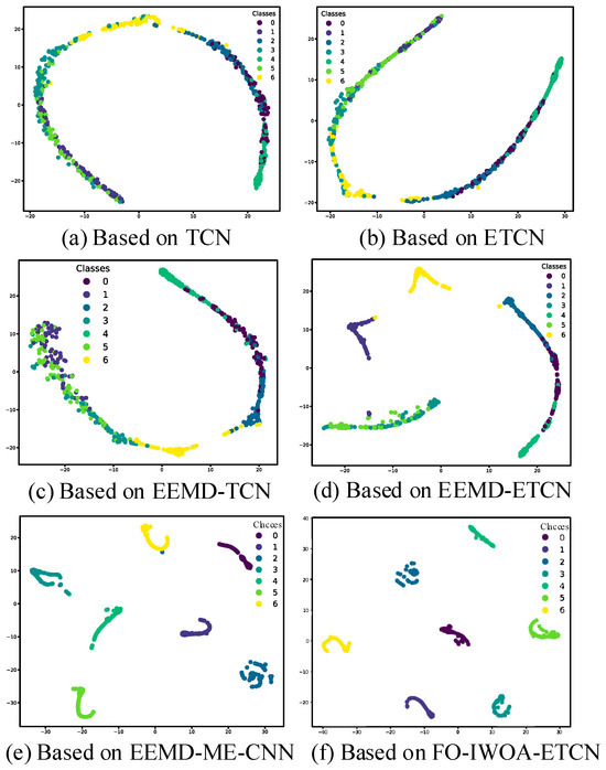 It can be observed that there is a significant overlap between the traditional TCN and the structurally extended ETCN model in the feature space, and the clustering of samples of different categories is unclear, indicating that the extracted features have strong confounding. Although the EMD-TCN and EMD-ETCN methods introduce the signal decomposition mechanism, the clustering structure is still not ideal, and the category boundaries are ambiguous. Especially under the EMD-ME-TCN method, there is a significant overlap between the fault samples of Type 2 and Type 6, resulting in a decrease in diagnostic discrimination.