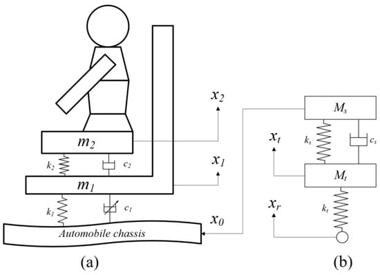 Dynamic model of vehicle-seat coupled suspension system. (a) Model of vehicle suspension. (b) Two-degree-of-freedom “human-seat” suspension system model.