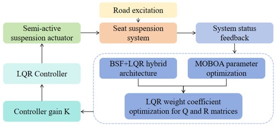 As intelligent driving becomes widespread, motion sickness challenges for vehicle occupants have grown more prominent. Vertical vibration in the frequency band of 0.1–0.5 Hz is most likely to cause occupant discomfort, which is closely related to the physiological sensitivity of vestibular organs, according to ISO 2631-1: 1997 [29] Evaluation Standard for Human Body Vibration. This study is based on the target frequency band established by this international standard and focuses on improving symptoms of dizziness by mechanical vibration attenuation, the effectiveness of which has been verified by a significant reduction in the vibration acceleration-weighted RMS value. The frequency-weighted LQR control method specifically addresses the motion sickness-sensitive frequency range (0.1–0.5 Hz) through the integration of frequency-domain objectives into the LQR quadratic performance metric. By incorporating a frequency response analysis with closed-loop pole configuration, this approach enables the accurate attenuation of vertical vibration energy within targeted frequency ranges. The design block diagram of the frequency-domain-weighted LQR control method proposed in this paper is shown in Figure 4.