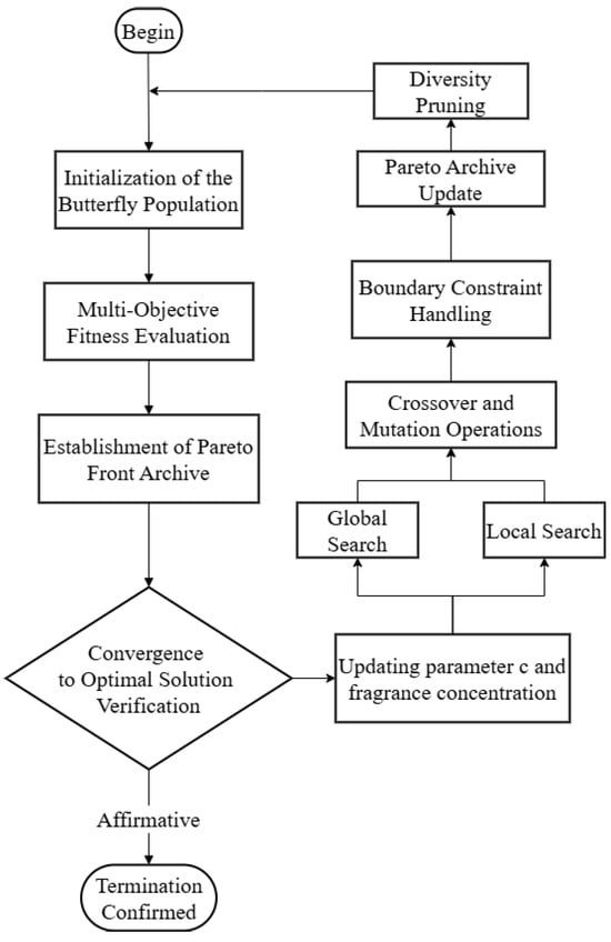 The selection of controller parameters critically influences the control gain matrix K in LQR, where varying parameter combinations can substantially alter the system performance characteristics. To enhance the controller optimization efficiency, this study proposes the multi-objective butterfly optimization algorithm for the efficient determination of optimal LQR weight matrices Q and R. The workflow for optimizing LQR weight parameters is depicted in Figure 5.