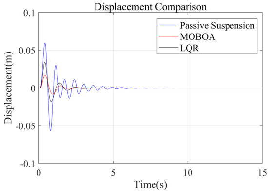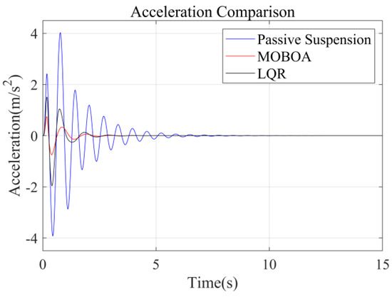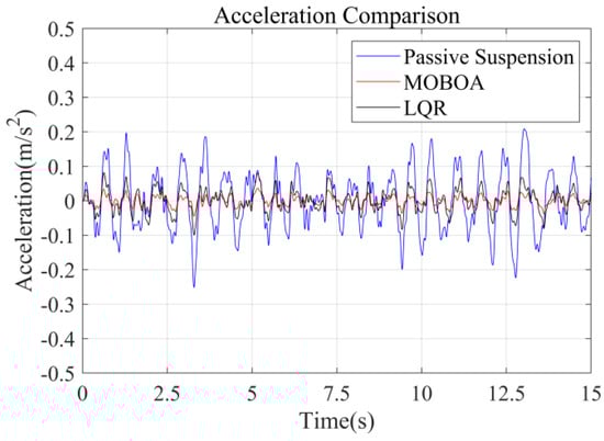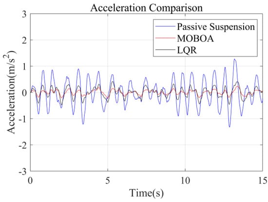 The simulation was carried out under the excitation conditions of the speed bump pavement, with a focus on investigating the vibration response characteristics under high-energy interference. Figure 17, Figure 18, Figure 19 and Figure 20 present the comparison results of the vertical vibration of the human body under the same working conditions by three control strategies. Among them, the MOBOA-LQR control strategy shows obvious technical advantages.