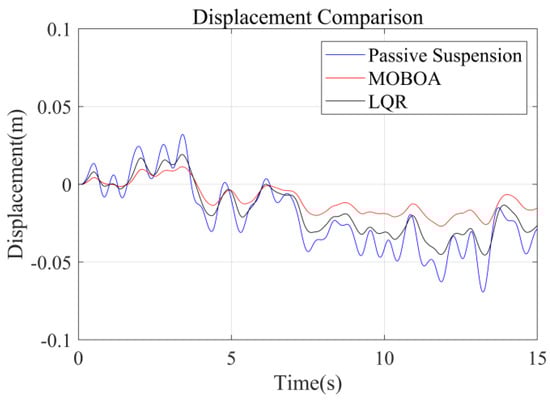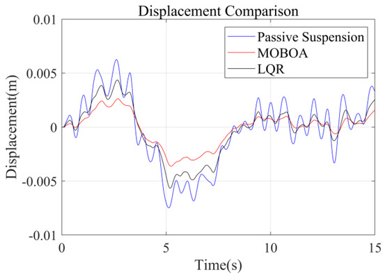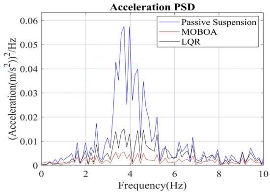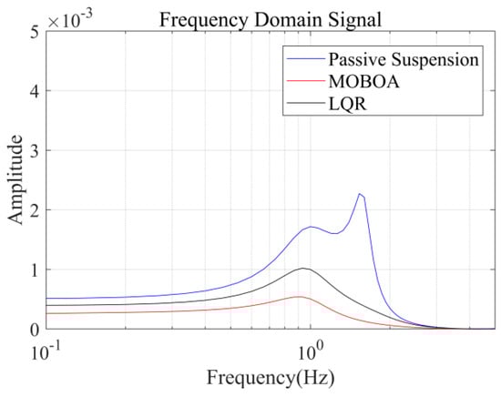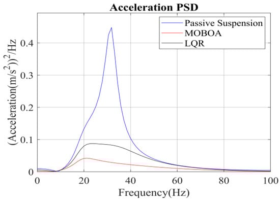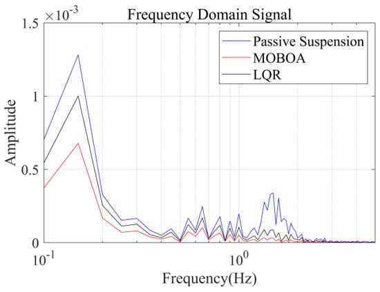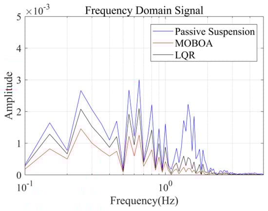 The frequency-domain analysis indicates that under the condition of C-level random pavement, the proposed control strategy achieves a significant vibration attenuation effect within the human body’s sensitive frequency band (0.1–0.5 Hz), which is highly consistent with the main spectral characteristics caused by motion sickness. To rigorously evaluate the control efficacy, comparative experimental results demonstrate that the MOBOA-LQR approach achieves a 41.04% reduction in human body displacement RMS and a 55.95% decrease in acceleration RMS relative to traditional LQR control systems. The quantitative metrics substantiate the technical merits of the proposed methodology for optimizing suspension system dynamics and elevating vehicular comfort performance.