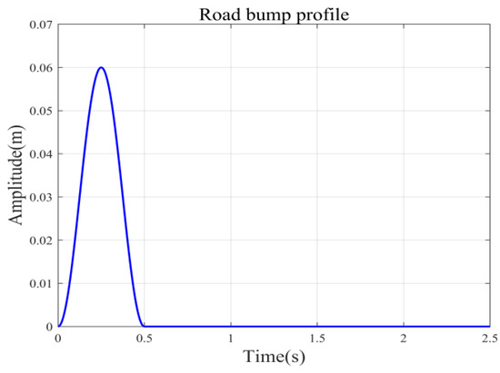 To analyze the performance of the suspension system under high-energy interference, speed bump pavement was selected for verification in this study. The speed bump pavement was modeled inspired by reference [28]. Formula (22) represents the contour of the speed bump pavement, and the road contour is shown in Figure 16.