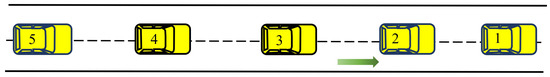 To assess the limitations associated with implementing a fixed maximum speed, this study simulates a five-vehicle platoon operating within a single-lane, straight-road traffic scenario. The platoon consists of a leading vehicle (designated as vehicle 1) followed by four trailing vehicles (designated as vehicles 2, 3, 4, and 5), as illustrated in Figure 1. The sensitivity coefficients of and are 0.41 and 0.2, respectively. The road speed limit and the maximum speed are both set to 18 m/s.