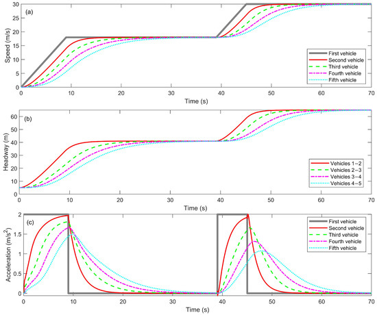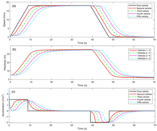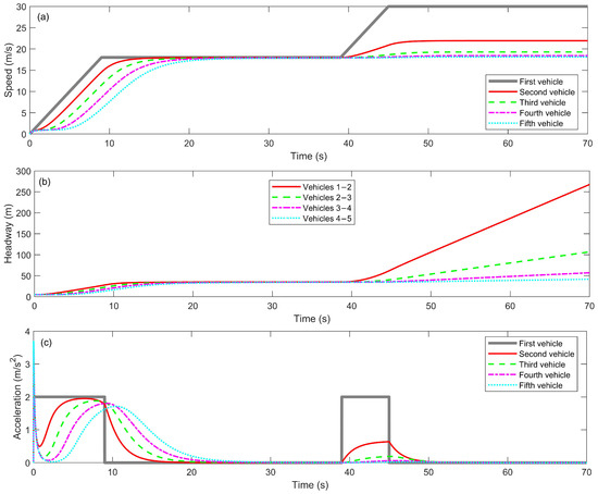 When the maximum speed of the platoon’s leading vehicle is used to determine the maximum speed in the OVF for the following vehicles, the evolution of the platoon traffic flow is shown in Figure 2. Figure 2a displays the speed of the five vehicles within the platoon, Figure 2b shows the headway between adjacent vehicles, and Figure 2c presents the acceleration of the five vehicles.