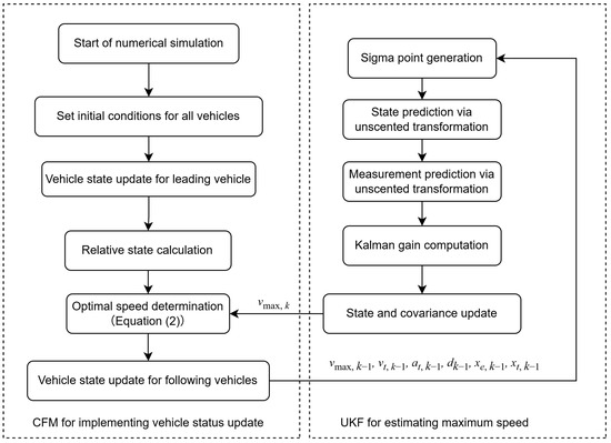 Figure 4 illustrates the overall process for estimating a vehicle’s maximum speed using an Unscented Kalman Filter (UKF). The main simulation cycle follows a logical sequence from “Start numerical simulation” to “Vehicle state update for following vehicles” on the left side of the diagram. On the right, the key steps of the UKF at each simulation step are depicted, including parameter initialization, Sigma point generation, state prediction and measurement prediction via an unscented transformation, Kalman gain computation, and the subsequent state and covariance updates.