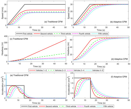 Before the simulation begins, the initial speed of each vehicle is 0 m/s, and the headway is the minimum safe distance of 5 m. After the simulation starts, the leading vehicle of the traffic flow begins to accelerate to desired speed of 30 m/s over a period of 15 s. Once the desired speed is reached, the leading vehicle continues to travel at a constant speed. In the traditional CFM, the maximum speeds of the following vehicles are fixed at 18 m/s. In the adaptive CFM, however, the maximum speeds of the following vehicles are dynamically estimated using an UKF, rather than being set to a fixed value. Figure 4 illustrates the evolution of speed, headway, and acceleration for all vehicles using the adaptive CFM proposed in this study, in comparison with the traditional CFM.