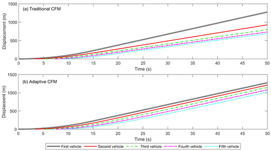 Evolution of vehicle displacement in single acceleration scenario: (a) Traditional CFM; (b) Adaptive CFM.