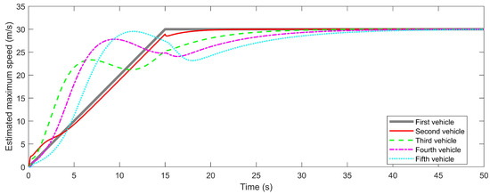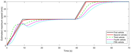 Figure 9 illustrates the maximum speed estimation of each following vehicle in the platoon through the UKF algorithm, with the speed of the leading vehicle representing the actual driving speed. The maximum speeds of the subsequent platoon members are gradually estimated based on the state of the leading vehicle. During the two acceleration phases, the leading vehicle’s maximum speed reaches approximately 18 m/s and 30 m/s, respectively. The estimated maximum speeds of the following vehicles rise rapidly during each acceleration phase but lag slightly behind the leading vehicle and exhibit varying degrees of fluctuation. This lag and fluctuation occur because each following vehicle needs to gradually adjust its maximum speed based on the preceding vehicle’s state to maintain stable following in the dynamically changing traffic environment. The speed estimation curve of the second vehicle closely follows that of the leading vehicle, responding quickly with minimal lag and fluctuation. In contrast, the speed estimations of subsequent vehicles (such as the third, fourth, and fifth vehicles) exhibit increasing lag and fluctuation, indicating that as the distance from the leading vehicle increases, the delay and instability in speed estimation accumulate. After the two acceleration phases, the maximum speed estimates of all vehicles gradually stabilize and approach the actual speed of the leading vehicle, highlighting the advantages of the UKF in dynamic speed estimation, which effectively reduces fluctuations and achieves speed synchronization. This dynamic estimation mechanism enables each vehicle in the platoon to effectively adjust its maximum speed, maintain coordination with the leading vehicle, and enhance the overall stability and efficiency of the traffic flow.