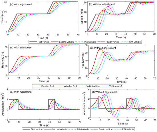 Traffic flow evolution for robustness analysis: (a) Speeds with adjustment; (b) Speeds without adjustment; (c) Headways with adjustment; (d) Headways without adjustment; (e) Accelerations with adjustment; (f) Accelerations without adjustment.