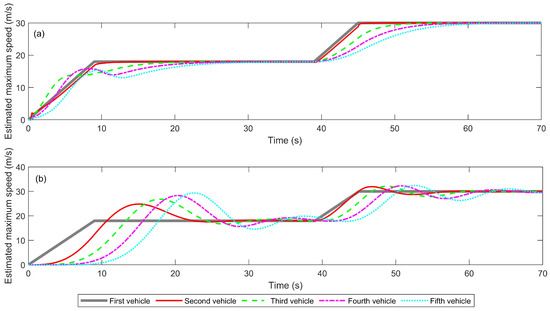 In Figure 11a, the adaptive adjustment results in smoother and more accurate estimations, closely tracking the actual speed of the leading vehicle with minimal fluctuations. In contrast, Figure 11b shows greater deviations and slower convergence without the adaptive adjustment, highlighting the challenges in accurately estimating the maximum speed under dynamic conditions. Overall, the adaptive method enhances estimation accuracy, ensuring more reliable vehicle-following behavior and improved traffic flow stability, especially in complex, changing environments.