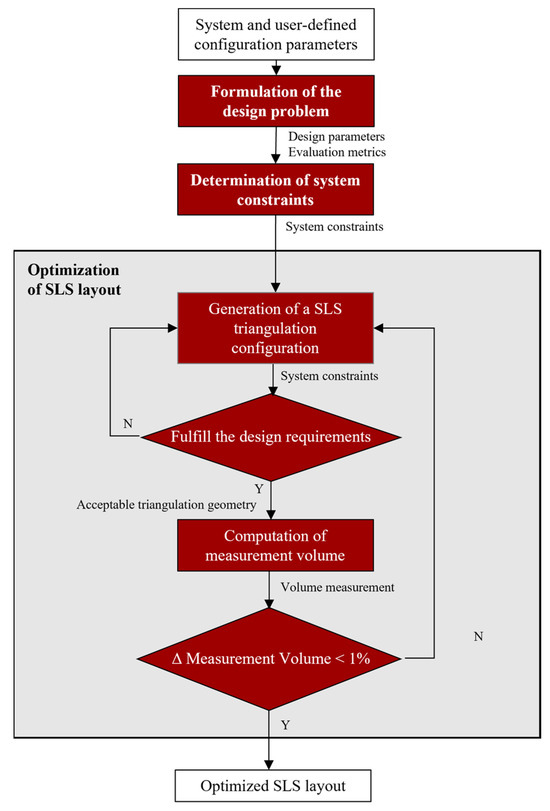 The first phase involves configuring SLSs by positioning the optical components (camera and projector) relative to the target, replicating the intended operational scenario. At this stage, all geometrical and optical parameters, including focal length, focus, zoom, depth of field (DOF), and field of view (FOV), must be fixed. The objective is to determine an optimal system configuration that maximizes the usable working volume while respecting physical space limitations.