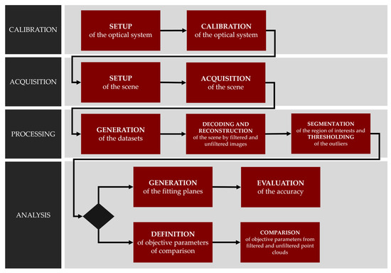 The methodology is structured into four main stages: calibration, acquisition, processing, and analysis. Before calibration, a critical setup phase is conducted to define the specific SLS configuration and the relevant working conditions. This preliminary phase ensures that the system is tested under realistic operational constraints and that the resulting performance metrics are both representative and repeatable.