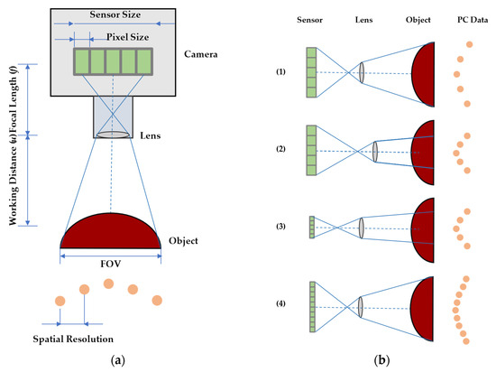(a) Illustration of the relationship between field of view (FOV), working distance (u), focal length (f), pixel size, sensor size, and spatial resolution. (b) Methods for improving spatial resolution: (1) the original setting before any adjustment; (2) by reducing FOV, spatial resolution improved but sacrifice coverage area; (3) by reducing pixel size, spatial resolution improved but sacrifice coverage area; (4) by reducing pixel size and improving pixel resolution, spatial resolution improved without sacrifice coverage area.