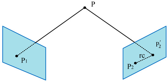 The visual reprojection error is the deviation between the projected position of a 3D point in the image and its actual observed position. This parameter is essential during the back-end optimization of a SLAM system. As shown in Figure 1, the observations of the spatial point P in two consecutive frames are P 1 and P 2 , where P 2 is the estimated projected position. The reprojection error is given by r c .