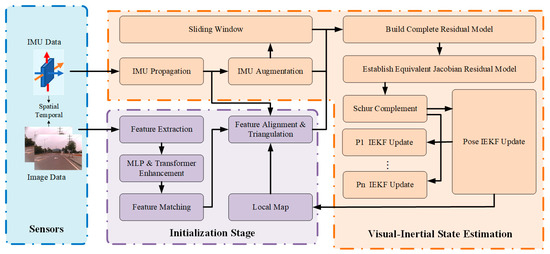 The main parts of the visual–inertial pose estimation algorithm proposed in this paper are MLP combined with Transformer to enhance ORB features and the Schur complement-optimized IEKF algorithm. In the visual processing part, the ORB algorithm is first used to extract feature points. ORB features have good real-time performance and stability in resource-constrained scenarios due to their efficient extraction speed and strong rotation invariance, and can provide reliable input for subsequent feature processing. In order to further improve the expressiveness and environmental adaptability of feature points, this paper uses MLP and Transformer models to enhance the extracted ORB feature points. The MLP captures local spatial dependencies through nonlinear mappings, while the Transformer enables global contextual modeling via a self-attention mechanism. This dual-module design significantly enhances the robustness of features to challenging conditions, such as viewpoint shifts and illumination variations. In the stage of visual and inertial information fusion, this paper adopts a state estimation method based on IEKF. IEKF can improve the consistency and accuracy problems of traditional EKF in strong nonlinear systems through iterative linearization and updating. In order to further improve the computational efficiency and convergence speed in the filtering process, this paper introduces the Schur complement optimization strategy in the IEKF framework. Schur complement optimization can effectively compress the system scale and reduce the computational complexity when marginalizing high-dimensional redundant variables, while maintaining the consistency and accuracy of system state estimation. It is especially suitable for the high-dimensional sparse structure after the joint residual construction in the visual inertial system. The relevant derivation process will be introduced in detail in this section. Through this series of designs, the method proposed in this paper significantly improves the accuracy and robustness of pose estimation in complex environments while maintaining high real-time performance. The overall framework of the algorithm in this paper is shown in Figure 2.