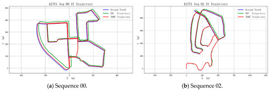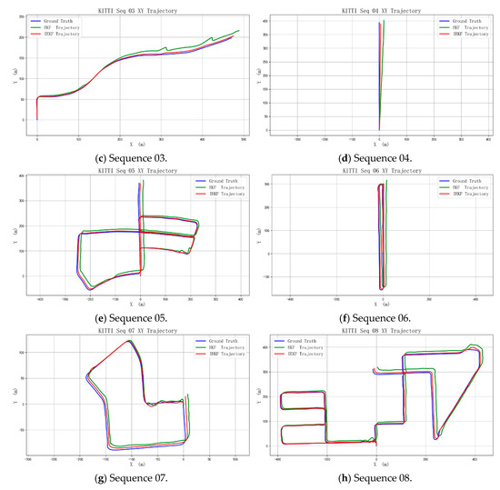 The EKF and the improved IEKF algorithms were applied to process sequences 00, 02, 03, 04, 05, 06, 07, and 08 of the KITTI dataset, as shown in Figure 8. The results indicate that the EKF estimated trajectory exhibits significant deviation from the true trajectory, while the trajectory estimated by the IEKF algorithm demonstrates much smaller errors, reflecting the higher accuracy of the IEKF.