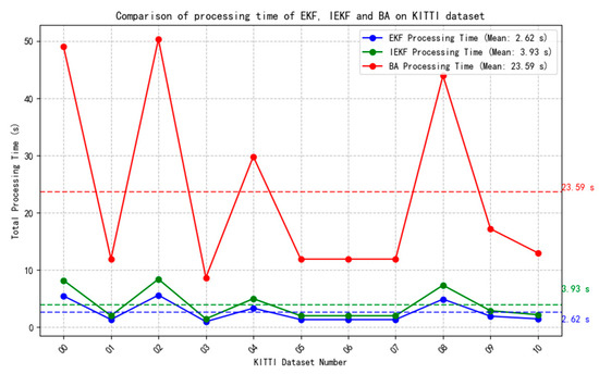 Figure 9. Comparison of processing time of EKF, IEKF, and BA on the KITTI dataset.