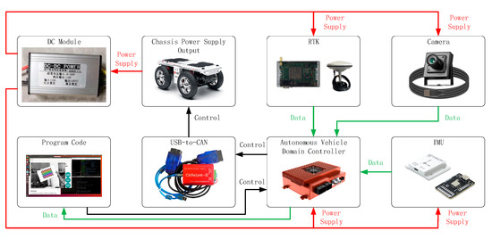 To further validate the practical applicability of the algorithm, a visual–inertial SLAM experimental platform was built based on an intelligent driving suite. The topological diagram of the experimental platform is shown in Figure 10. In the power supply topology, the output of the chassis with a battery is 48 V. To meet the power supply requirements of various sensors, a DC-DC module is used for voltage conversion, which steps down the 48 V to a stable 12 V output. The converted 12 V power is used to supply sensors such as the domain controller, camera, IMU, and RTK, as indicated by the red connecting lines in the diagram. In the data topology, the camera, IMU, and RTK sensors send their data back to the vehicle’s domain controller, as shown by the green connecting lines. The domain controller processes the data through software and outputs control signals. These control signals are transmitted via the domain controller to the CAN card, thereby controlling the vehicle, as indicated by the black connecting lines.
