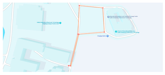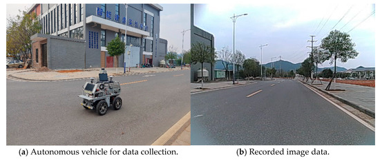 After the experimental platform was established, data collection was conducted on the regular driving routes within the campus to evaluate the performance of the EKF and IEKF algorithms in pose trajectory estimation. The overall route map is shown in Figure 11. Figure 12a shows a photo taken during the data collection process, which includes the autonomous vehicle used for data acquisition and the actual environment during the data collection. Figure 12b displays the image data from the self-collected dataset.