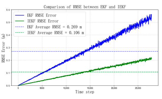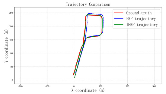 As shown in Figure 13, in the trajectory estimation, the EKF trajectory clearly deviates more from the real data compared to the IEKF trajectory. This indicates that the IEKF algorithm has higher accuracy than the EKF algorithm. According to Figure 14, the RMSE of EKF is 0.268 m, while the RMSE of IEKF is 0.106 m. The error of IEKF is 60.45% lower than that of EKF, representing a significant error reduction. The overall performance of the self-collected dataset is similar to that of the public dataset tests, aligning with the simulation’s expectations. This suggests that the proposed improved algorithm maintains a high level of accuracy and low error, even with a slight sacrifice in computational speed.