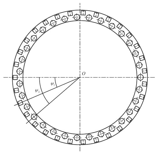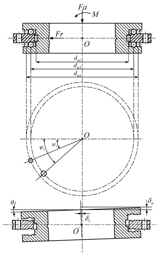 As illustrated in Figure 3, the inner ring of the bearing experiences axial displacement (δa), radial displacement (δr), and a rotation angle (θ) due to the combined effects of axial force (Fa), radial force (Fr), and overturning moment (M). In the figure, ψ1 denotes the position angle of the axial row of rollers, ψ2 indicates the position angle of the axial row of balls, dm1 represents the pitch circle diameter of the axial rollers, dm2 signifies the pitch circle diameter of the axial balls, and dmr refers to the pitch circle diameter of the radial rollers.