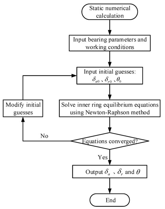 By combining the above equations and substituting the parameters of the novel ball–roller composite turntable bearing, the equilibrium equations of the bearing inner ring are solved using the Newton–Raphson iterative method. The Newton–Raphson method is implemented primarily with MATLAB 2023b software. Under combined loading conditions, the axial displacement (δa), radial displacement (δr), and deflection angle (θ) of the inner ring are obtained, based on which the loads borne by each rolling element can be further calculated. The computational flowchart is shown in Figure 5.