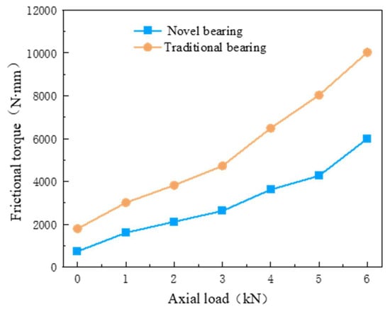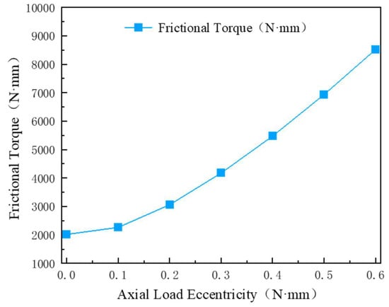 Figure 16 illustrates that the total friction torque of the bearing increases progressively with the axial load eccentricity. The initial slow growth can be attributed to the pre-deformation induced by the axial negative clearance of the bearing, which diminishes the overturning moment. However, when the overturning moment reaches a substantial level, the impact of the negative clearance becomes less pronounced. Consequently, in practical engineering applications, it is advisable to minimize the eccentricity of the axial load.