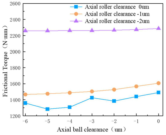 When the axial load is set at 5 kN, the axial roller clearance is maintained within the range of 0 to −2 μm, while the axial steel ball clearance is adjusted within the range of 0 to −6 μm. An analysis is conducted to investigate the influence of varying axial clearances on the total friction torque of the bearing, with the results illustrated in Figure 14.