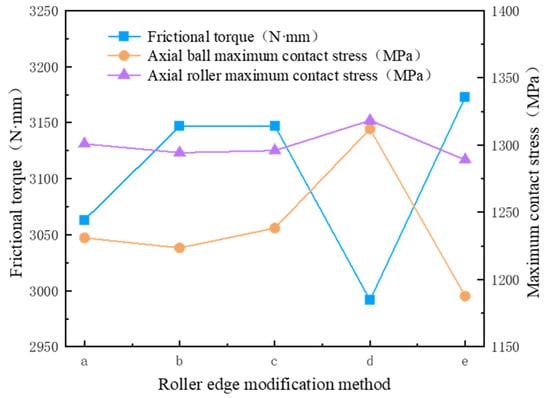 Under the conditions of an axial load and radial load of 3 kN each, alongside an overturning moment of 600 N·m, an axial roller clearance of −1 μm, a steel ball clearance of −5 μm, and a steel ball groove curvature radius coefficient of 0.52, the influence of various roller crowning methods on bearing friction torque was analyzed. The results are illustrated in Figure 18, where “a” denotes logarithmic crowning, “b” indicates arc-slope crowning with the centers positioned at both sides, “c” represents arc-slope crowning with the center on the midline, “d” signifies full convex roller crowning, and “e” depicts straight rollers.