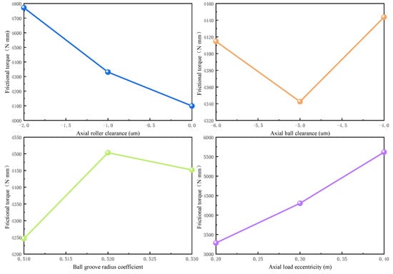 Building upon the single-factor analysis, a multi-factor coupling analysis is conducted to further investigate the interaction effects of multiple key parameters on friction torque. An orthogonal design method based on the numerical model is employed to perform the combined parameter study. Four major factors are selected: axial roller clearance, ball clearance, ball groove curvature radius coefficient, and axial load eccentricity. Each factor is set at three representative levels, and an L9(34) orthogonal array is constructed, resulting in a total of nine test scenarios. The friction torque model is utilized to calculate the response value under each parameter combination. Main effect analysis and range analysis are subsequently performed to quantify the influence of each factor on friction torque and to determine the sensitivity ranking. This reveals the evolution characteristics of friction performance under different parameter combinations. This analytical approach not only identifies the dominant control factors but also provides a multidimensional design reference for structural optimization and parameter configuration of the bearing.