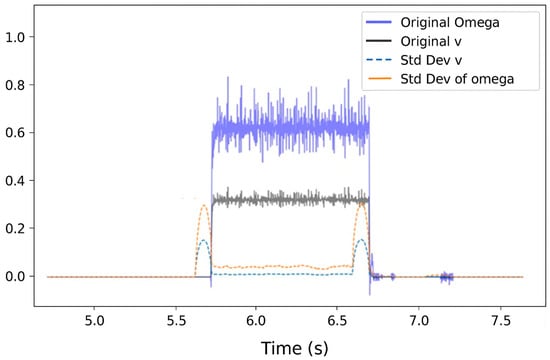 First, the odometry data are read from the ‘wheel_odom.csv’ file using the pandas library. The file contains the robot’s linear velocity (‘v’) and angular velocity (‘omega’), and is loaded from the user’s desktop. We selected these columns from the dataset and applied a 100-item motion window to calculate the standard deviation of the data. The code iterates through the dataset, calculating the standard deviation at each point using the current and next 99 data points. This method reflects the temporal variability of the data. If fewer than 100 data points are available at the end of the dataset, the code repeats the last calculated standard deviation value to ensure that a standard deviation is assigned to all data points. Figure 2 shows the scatter deviation of the odometry data.