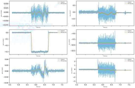 Applying a moving average filter to the IMU and wheel-code data (Figure 4) offers significant benefits. This filter is an effective tool for reducing noise and minimizing short-term fluctuations while preserving the underlying trends in the data. The moving average filter works by averaging recent measurements from the dataset, which helps smooth out short-term changes and create a more consistent data series. This is particularly useful in robotics, where sensor data often contain random noise or sudden changes caused by the robot’s movements or environmental factors.