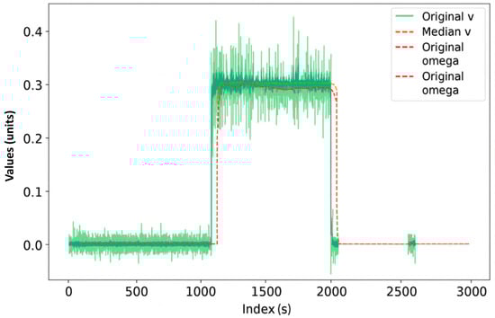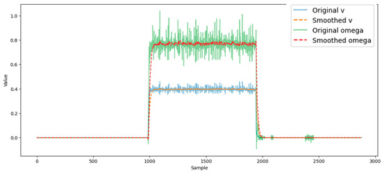 - “Original v” shows the robot’s linear speed as a function of time. Linear speed is important for positioning the robot during straight-line movements. Maintaining a constant velocity is essential for predictable and accurate navigation, as shown in Figure 3.