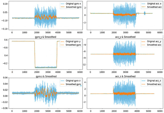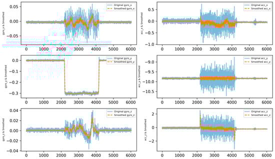 Exponential smoothing effectively reduces the noise in the gyroscope and accelerometer data, allowing for more accurate observation of the robot’s real-world motion. The rotation along the X-axis shows a stable trend, although with some outliers. Y-axis rotation was relatively stable with little noise. The angular velocity and acceleration along the Z-axis showed initial noise data, but became more stable after smoothing, reflecting the dynamics of the robot’s motion. The smoothed data help to more easily interpret the smooth trends and possible changes, which will facilitate more accurate navigation and environmental interactions (Figure 7).