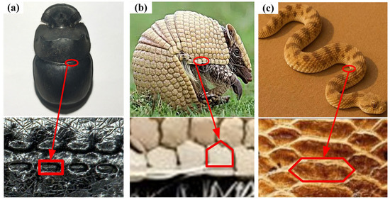 Research has shown that crawling organisms in nature, such as dung beetles, armadillos, and desert snakes, have gradually formed microstructures with excellent wear reduction and abrasion resistance on their surfaces over a long period of evolution. These structures exhibit excellent anti-adhesion, drag reduction, and anti-wear properties, and have important potential for engineering biomimicry. Therefore, this study selected these three animals as biomimetic prototypes and introduced their typical surface microstructures into the design of microstructure surface sliders, in order to improve their frictional performance. Specifically, during the process of pushing heavy objects (such as with dung balls), dung beetles are less likely to adhere to soil on their surfaces. Their backs are concentrated with quadrilateral pits, which can effectively reduce surface adhesion and friction by reducing the actual contact area and storing air. The surface of the armadillo is composed of sheet-like pentagonal scales, with small gaps between the scales, which endow its outer skin with both flexibility and rigidity; it can cushion external friction and impact during movement, disperse stress concentration, and demonstrate good wear resistance. The surface of the abdomen of desert venomous snakes presents a highly ordered, regular hexagonal scale arrangement, with tightly connected scales and certain sliding ability. Its geometric regularity and directionality help significantly reduce frictional resistance during the sliding process. The unique advantages of these animal body surface structures provide important biomimetic insights for the construction of high-performance wear-resistant surfaces. Figure 1 shows the biomimetic micro-pit structure morphology extracted based on three biological prototypes.