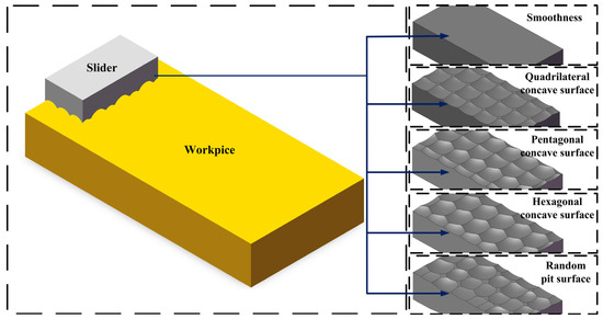 In this study, the surface characteristics of the dung beetle, armadillo, and sidewinder snake were selected as bionic prototypes to design three types of dimple structures: quadrilateral, pentagonal, and hexagonal. Corresponding 3D solid models were constructed using SolidWorks (Dassault Systèmes, Waltham, MA, USA, Version 2023), as shown in Figure 2. The upper specimen (slider) has dimensions of 4 mm × 2 mm × 1 mm, while the lower specimen measures 12 mm × 6 mm × 2 mm.