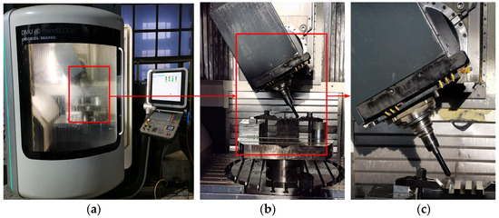 Numerical control machine tool used in the experiment. (a) External view of the five-axis CNC milling machine. (b) Processing state with 45 ° inclination of main shaft. (c) Local enlarged drawing of surface contact.