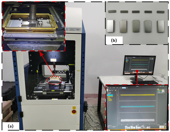 The friction and wear tests were conducted using an MFT-5000 tribometer (manufactured by Rtec Instruments, San Jose, CA, USA) under dry sliding conditions. The sliding stroke was 25 mm, with a frequency of 5 Hz and a normal load of 80 N. The total test duration was 6 min. According to these parameters, the reciprocating sliding occurred approximately 4200 times, resulting in a total sliding distance of about 105 m. The experimental setup and procedure are illustrated in Figure 6a. To ensure the accuracy of the test results, all specimens (as shown in Figure 6b) were cleaned with an alcohol solution before and after testing, and their masses were measured using an electronic balance with a precision of 1 mg. The wear resistance of the specimens was evaluated by comparing the mass loss before and after the test.