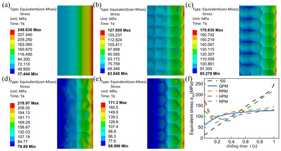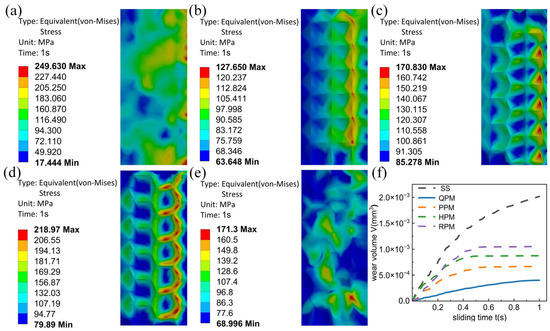 Equivalent stress contour maps and evolution curves with sliding time for different bionic functional surfaces. (a) Smooth surface equivalent stress cloud map; (b) Surface equivalent stress cloud map of quadrilateral concave pit morphology; (c) Surface equivalent stress cloud map of pentagonal pit morphology; (d) Hexagonal pit morphology surface equivalent stress cloud map; (e) Surface equivalent stress cloud map of randomly distributed pit morphology; (f) Time dependent curves of equivalent stress on different biomimetic surfaces, SS (Smooth Surface), QPM (Quadrilateral Pit Morphology), PPM (Pentagonal Pit Morphology), HPM (Hexagonal Pit Morphology), and RPM (Random Pit Morphology).
